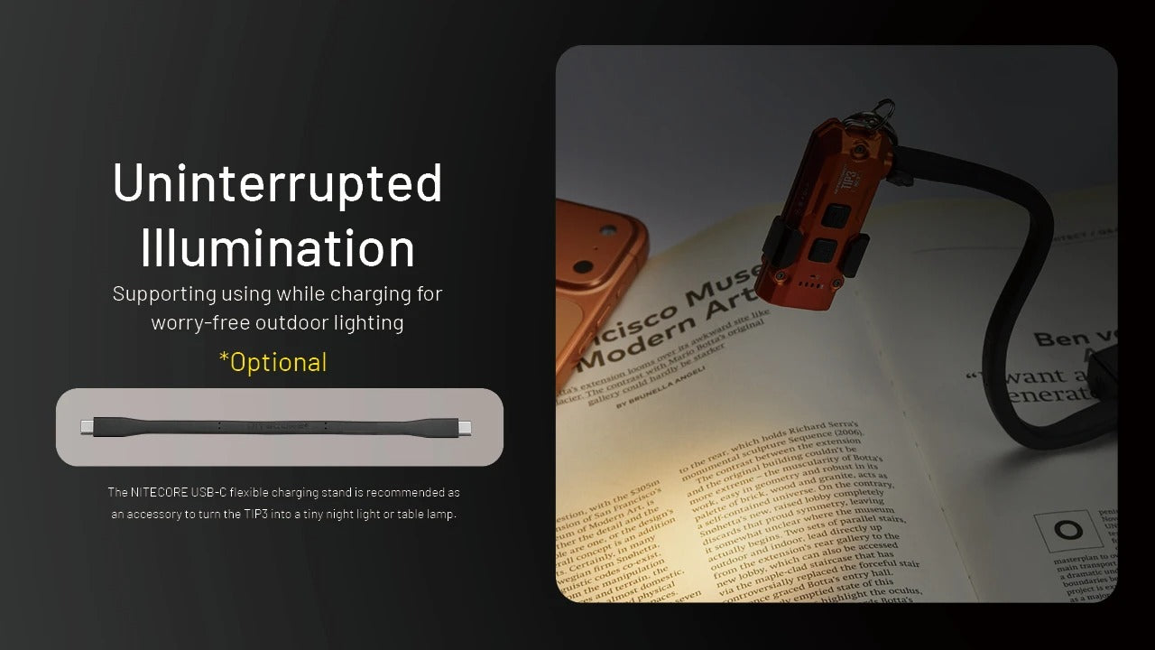 INSTANT TABLE LAMP — Connect your Nitecore keychain light to a USB-C power source and bend the cable to aim the light at a book, map, or workspace. The cable holds its position, giving you a hands-free light for reading, working, or navigating.