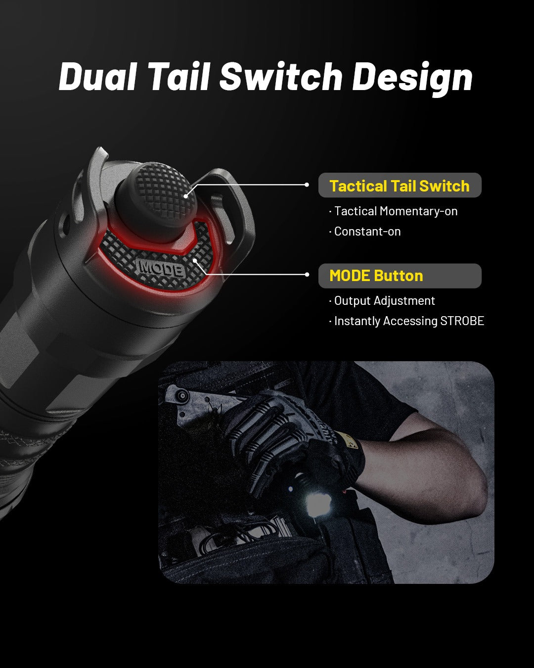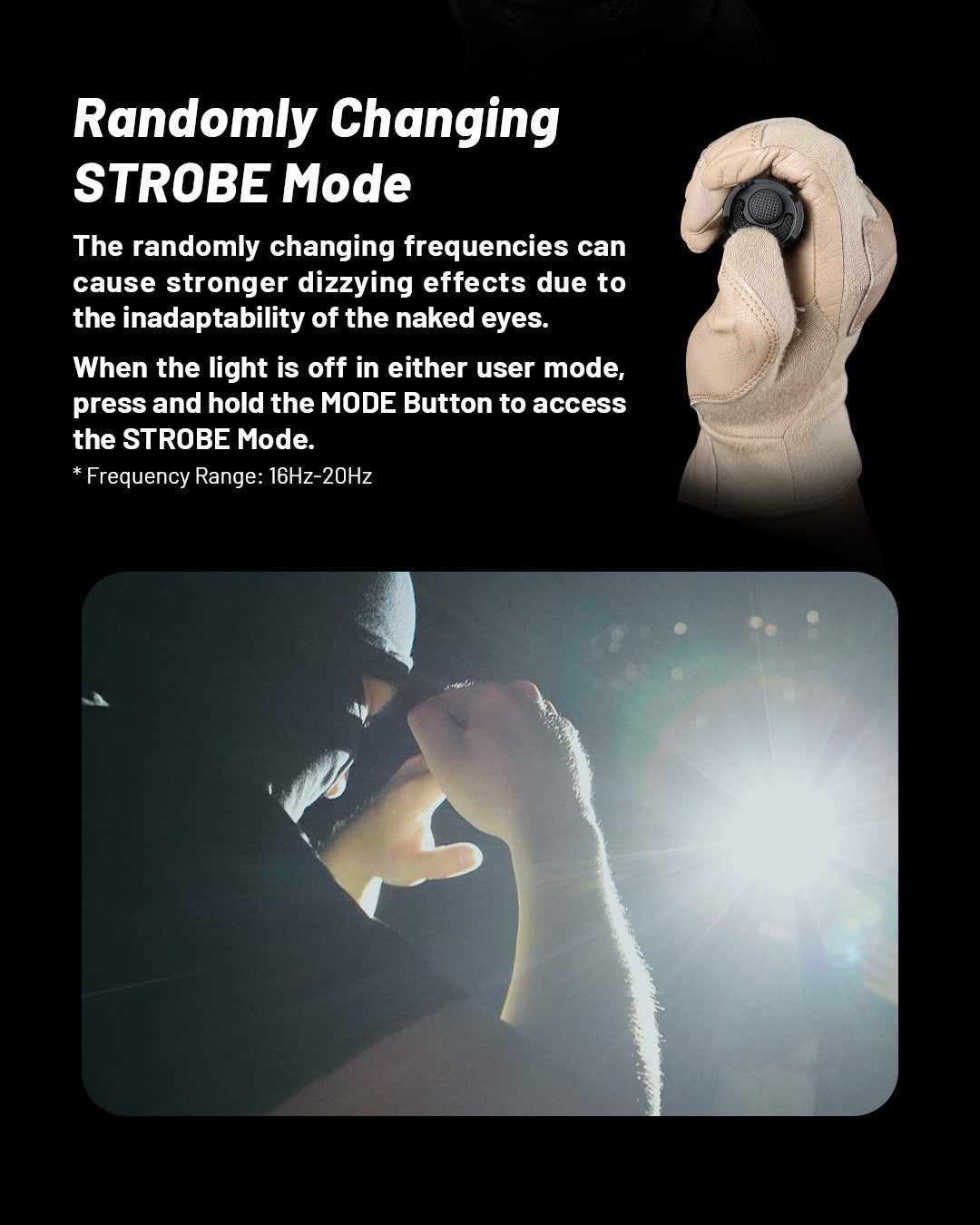 One-handed instant strobe access and controls for use with your sidearm, beam pattern designed to match ideal engagement ranges, silent signaling, ultra-strong strike bezels with glass breakers, removable batteries, and USB-C fast charging, all features that were designed for the operator to function at their best.
