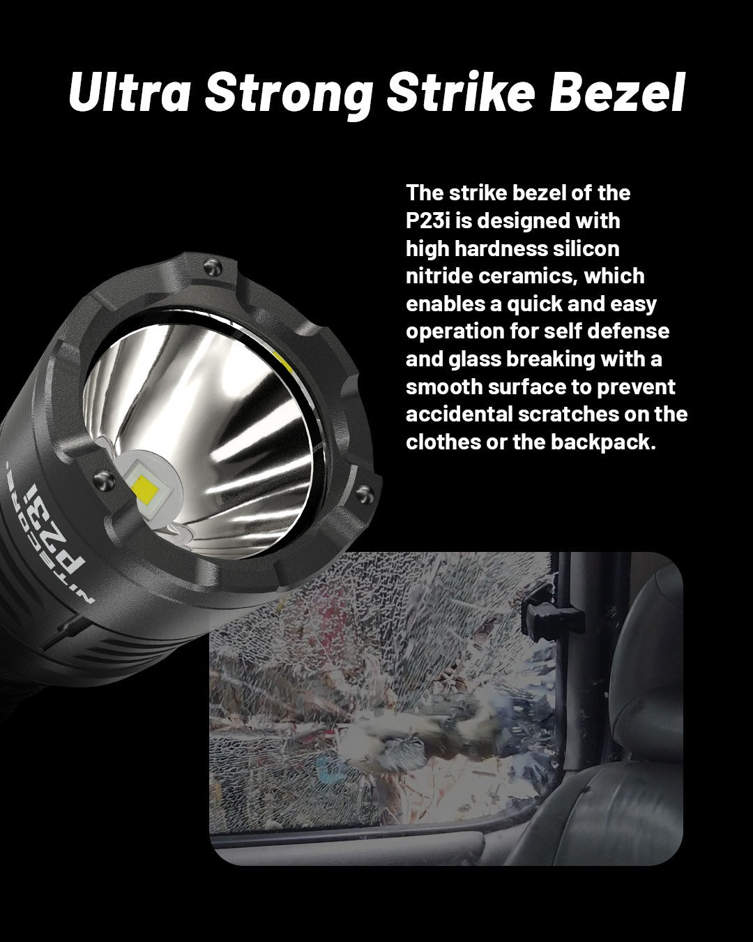 HIDDEN GLASS BREAKER - 3 blacked-out ceramic beads on a hardened steel bezel. These work to focus all impact into a single point on the glass, immediately shattering it with ease. The entire bezel is tough and nails and impossible to break.