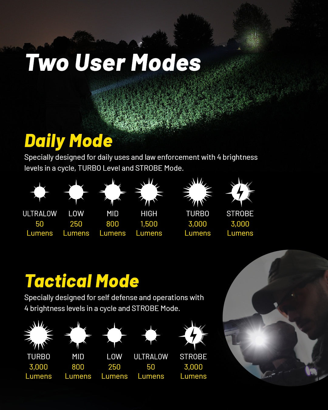 MODE LUMENS RUNTIME DISTANCE