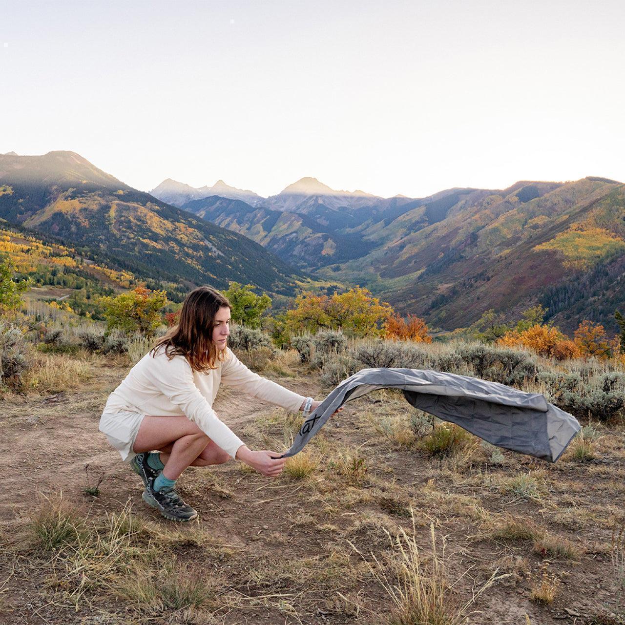 SOLO HIKING & BACKPACKING - Trail breaks, summit meditation, scenic lunches. Personal-sized comfort without group blanket bulk. Tether points secure it during alpine winds on exposed ridges.