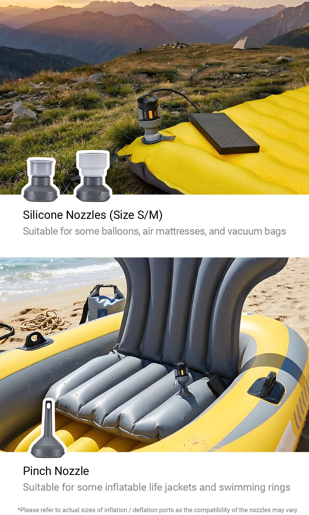 SILICONE NOZZLES (SIZE S & M) - Seal against balloons, inflatable sleeping mattresses and vacuum storage bags, so the same pump that fills your pad in the evening packs your down jacket flat in the morning.