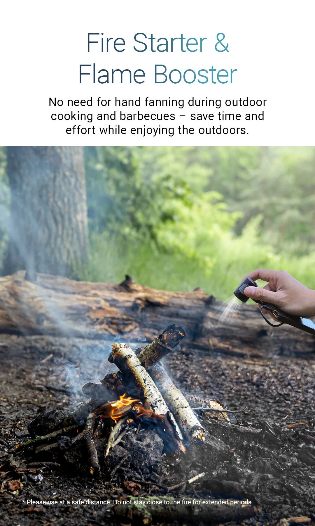 For a bonfire in a cool night, the pump doubles as a gentle bellows for coaxing a reluctant flame back to life. Keep a safe distance from the fire and short-burst it on the embers rather than holding it close to the flames.