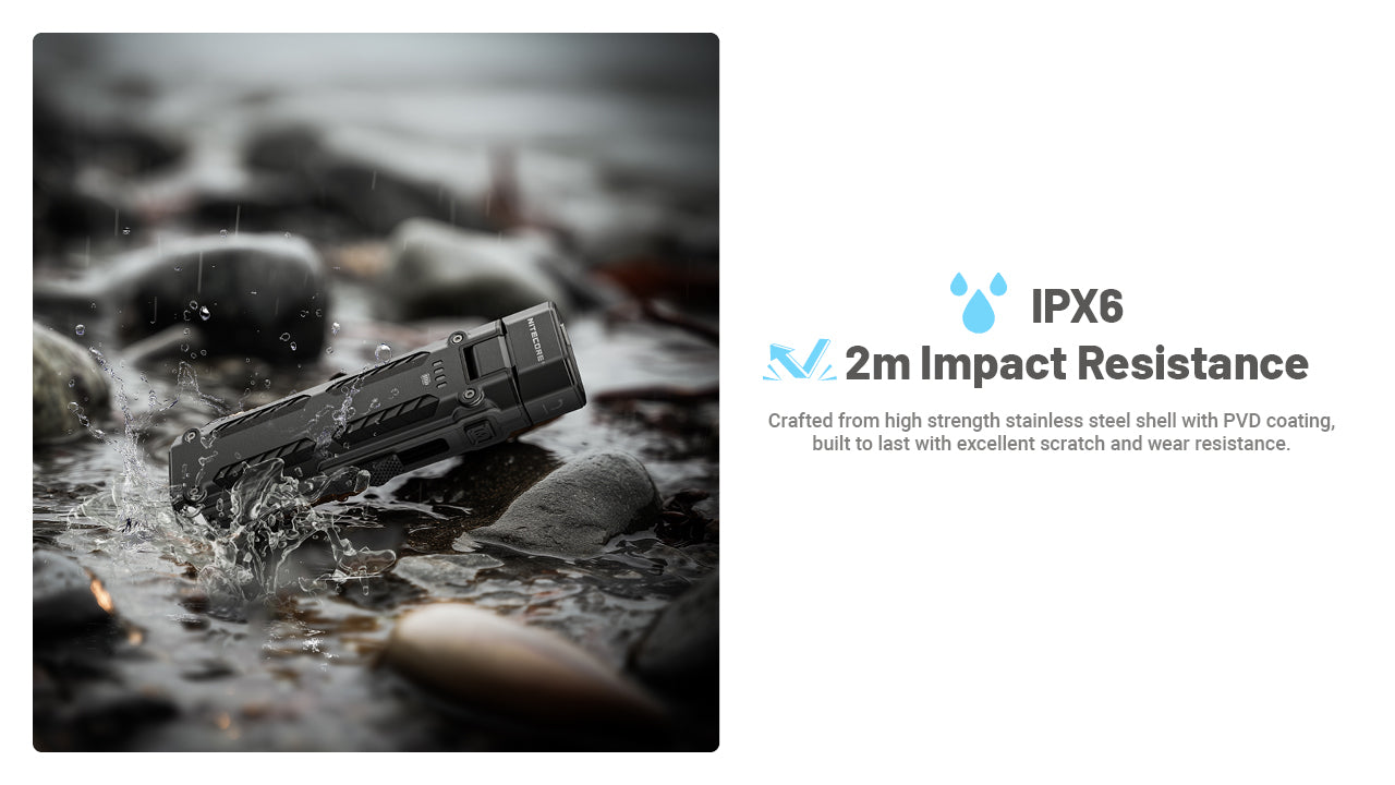 The stainless steel body with PVD coating handles daily carry abuse. IPX6 waterproofing survives rain and splashes. 2-meter impact resistance means drops on concrete don't end your shift.