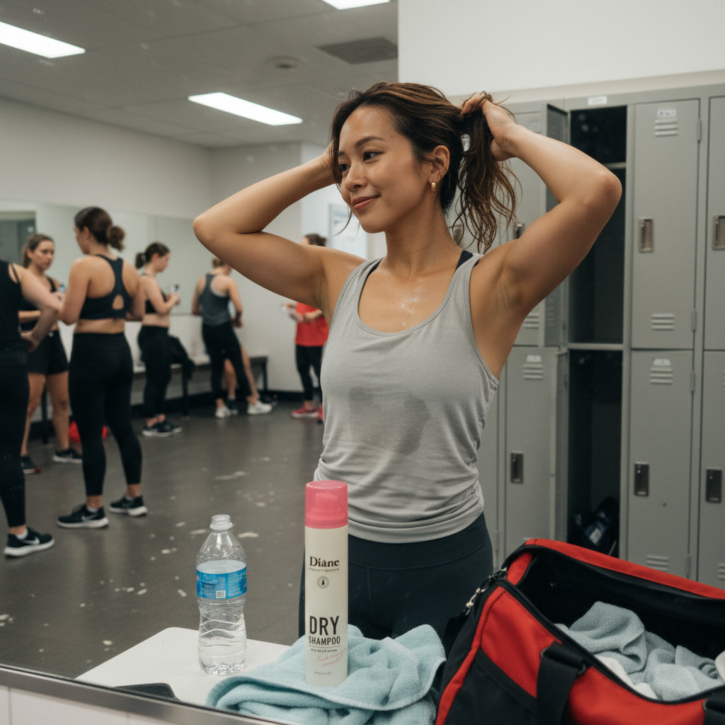 Post Workout | Spray at roots, massage scalp, brush through | Oil absorption, sweat removal, fresh volume |