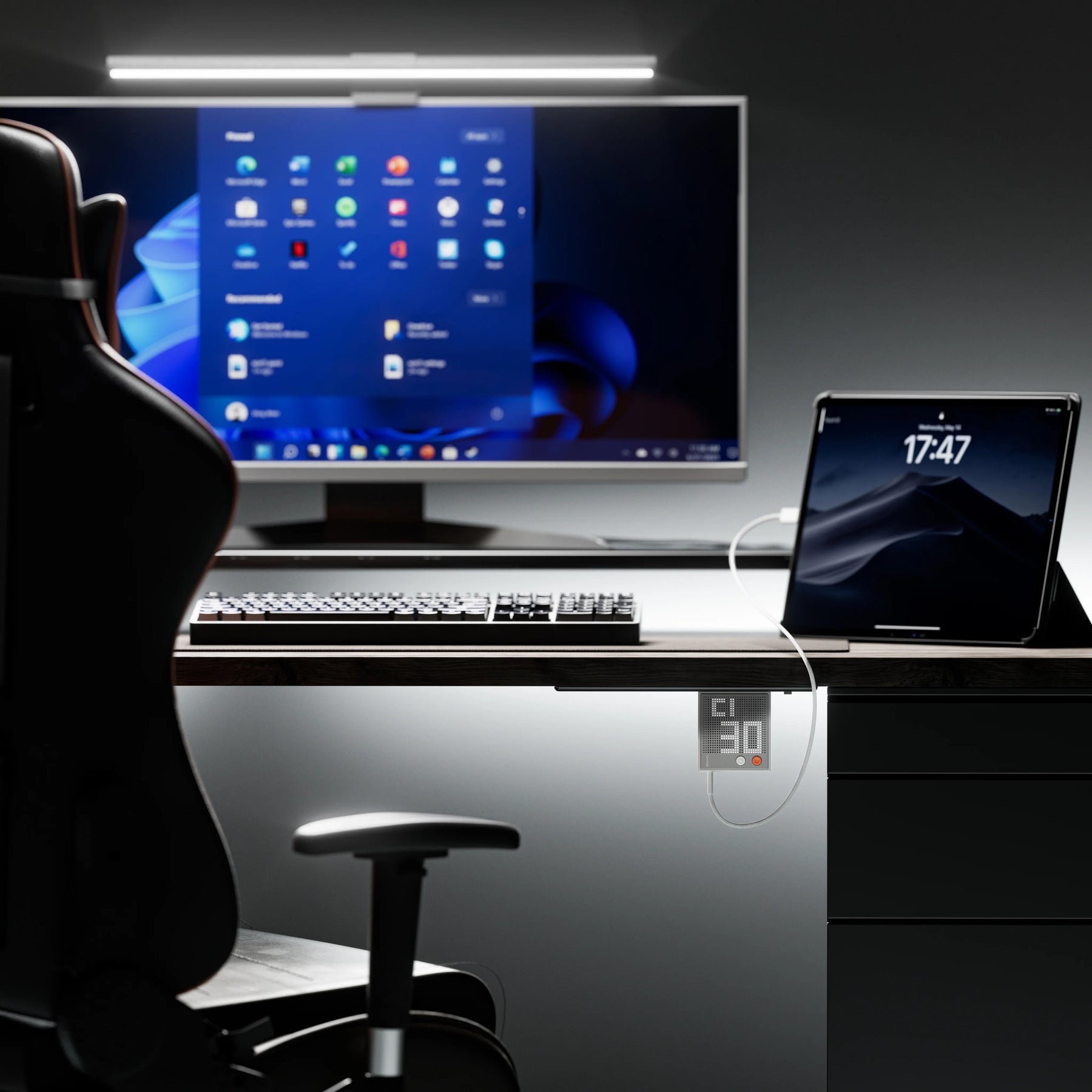 Clean desk setup with one charger handling laptop, tablet, and phone. The display shows what's charging without checking devices.