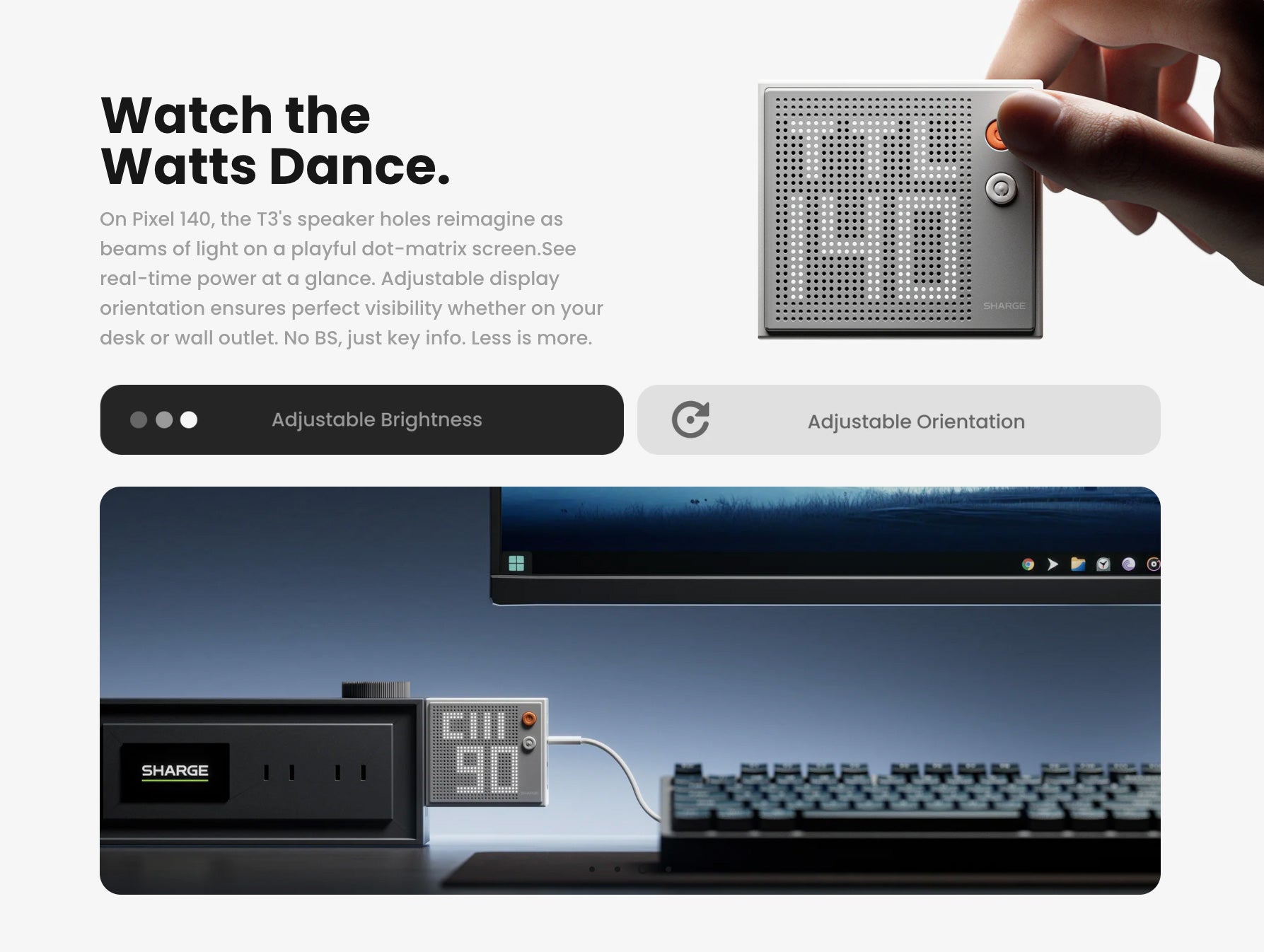 The adjustable dot-matrix display shows exactly what's charging and how fast. Customize brightness and screen orientation for desktop or wall outlet use.