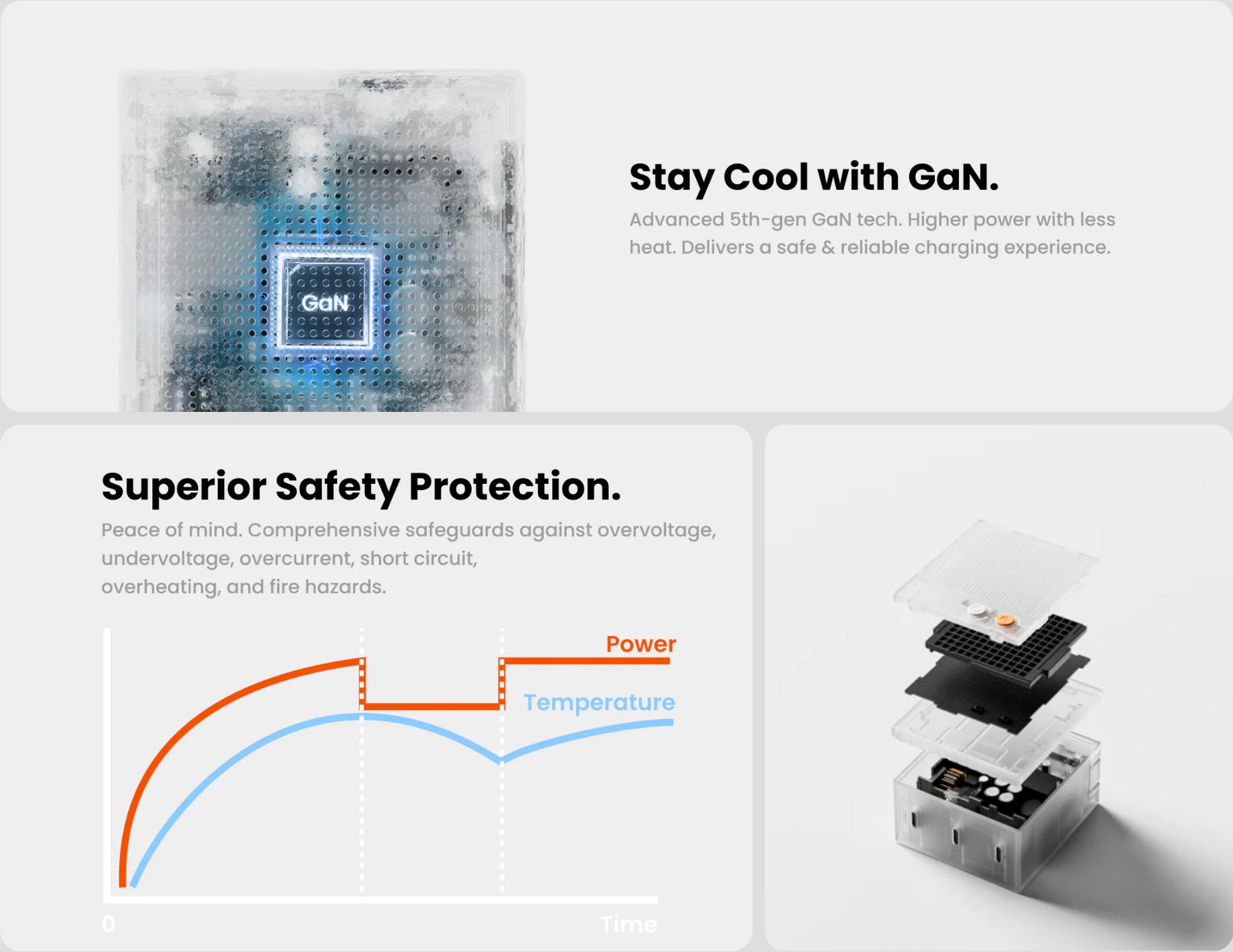 GaN III technology with PFC+LLC architecture delivers more power in less space while running cooler than traditional silicon chargers.