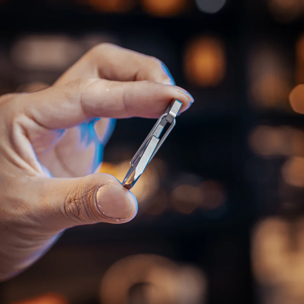 Machined from a single block of titanium with two separate compartments, your keys are safely tucked away and won't fall out when you unlatch the top.